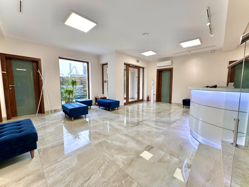 Każdy gabinet posiada ogrzewanie podłogowe, klimatyzację, meble w zabudowie, asystor, biurko z fotelem dla lekarza lub terapeuty, dostęp do internetu, oświetlenie sufitowe neutralne, żaluzje zewnętrzne.