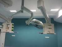 Używana lampa operacyjna Maquet Prismalix, podwójna, sufitowa. Lampa Maquet wypuszczona na rynek pod nazwą marki ALM Wariant ramion PRX 8401 ACS SF CFF (Schemat widoczny na zdjęciach) Dwie czasze bezcieniowe typ 8000 i 4000. Czasza jednoogniskowa ALM 8000: