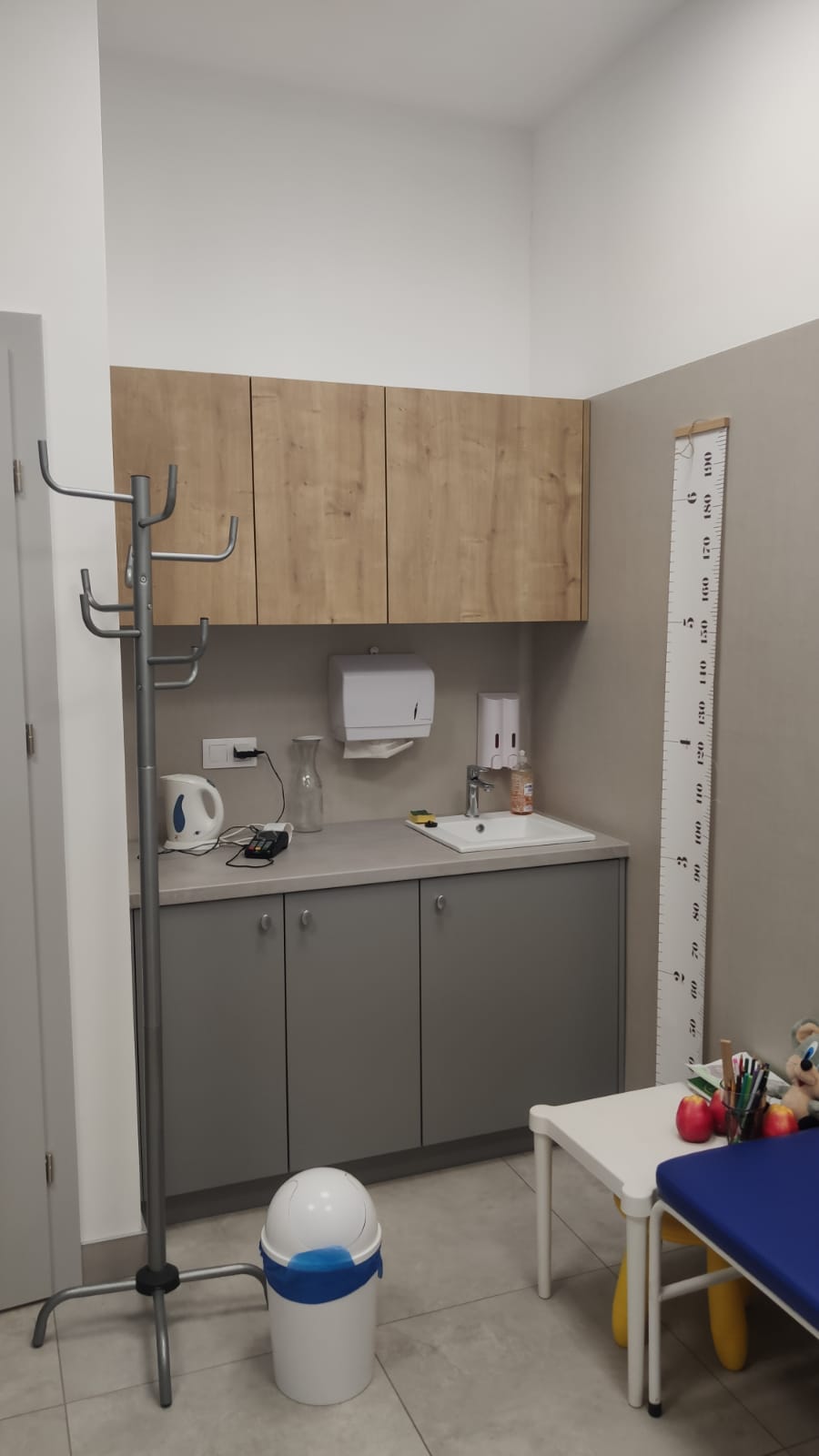 Gabinet wyposażony jest w biurko, krzesła, leżankę, szafki, kącik sanitarny oraz klimatyzację.